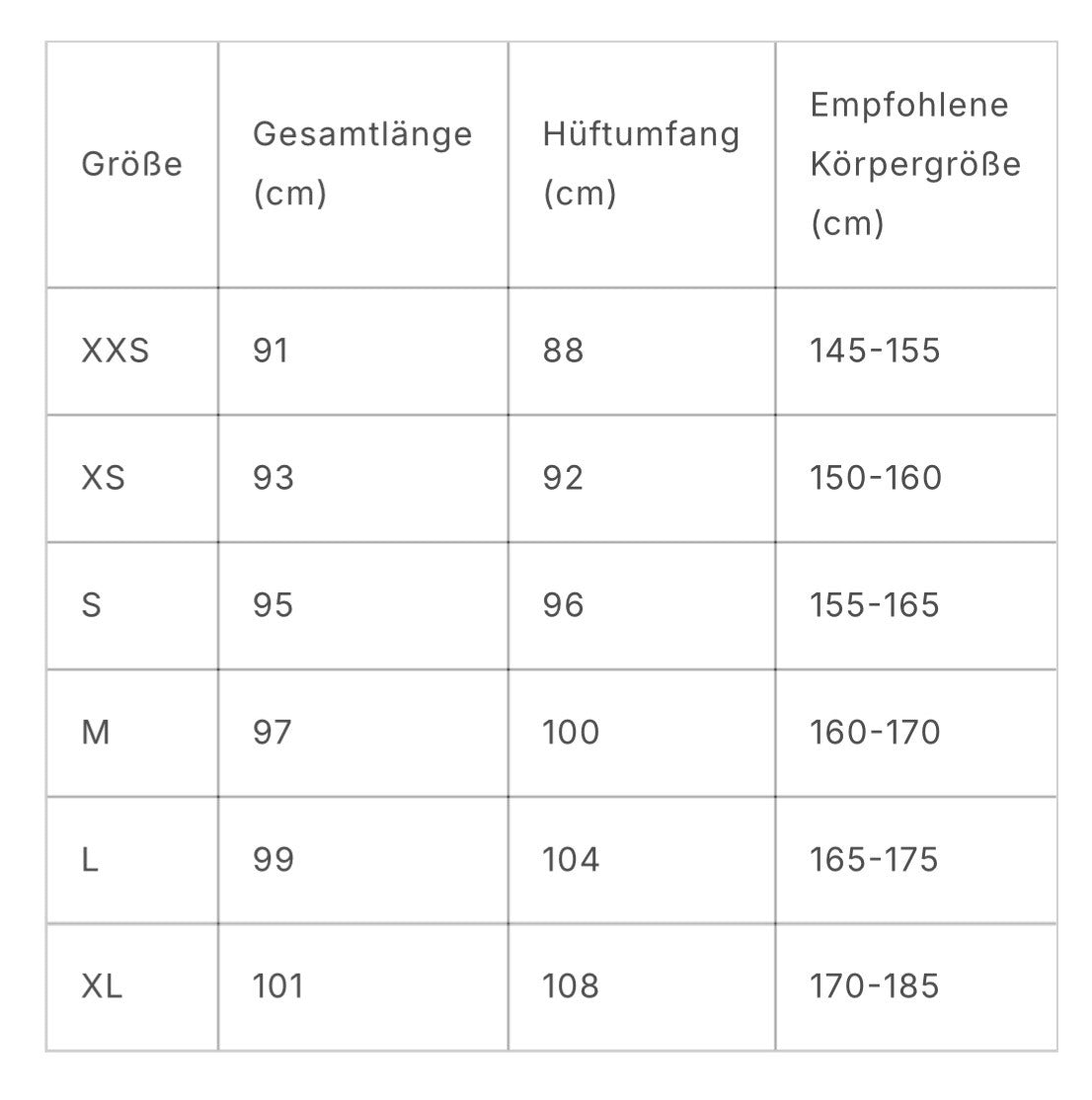 | Größe | Gesamtlänge (cm) | Hüftumfang (cm) | Empfohlene Körpergröße (cm) |