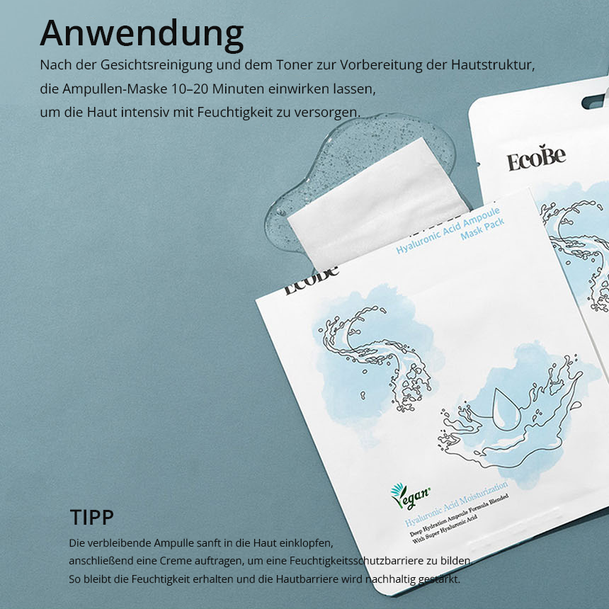 Nach der Reinigung Ihres Gesichts tragen Sie die Maske vorsichtig auf und stellen Sie sicher, dass sie gut an die Konturen Ihres Gesichts angepasst ist. Lassen Sie die Maske 15-20 Minuten einwirken und entfernen Sie sie dann vorsichtig. Sie können die verbleibende Essenz sanft in Ihre Gesichtshaut einmassieren, um zusätzliche Feuchtigkeit zu spenden.